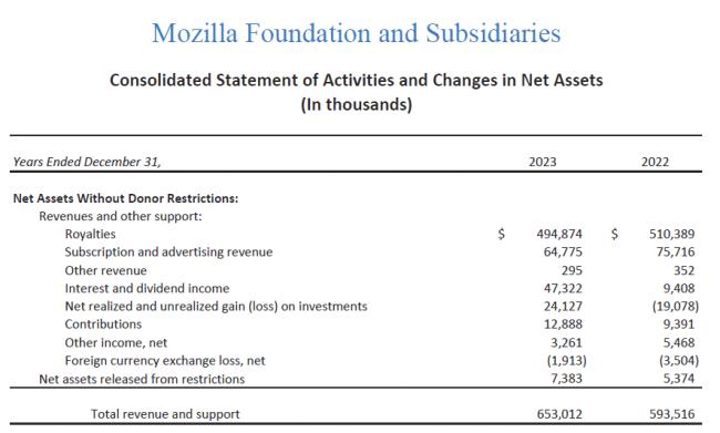 Mozilla最新的一期财报披露,2023财年合计6.53亿美元总收入里,有将近5亿美元是从各路搜索引擎收回来的版税,收入贡献排名第二的则是用户和广告金主们的投喂。