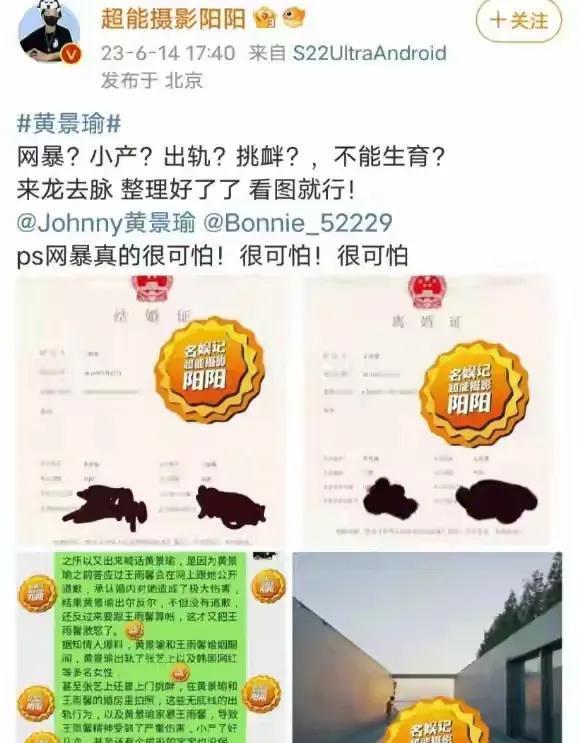 当时她晒出结婚证还有和黄景瑜家人一起出游的照片,以及她被打的证据。