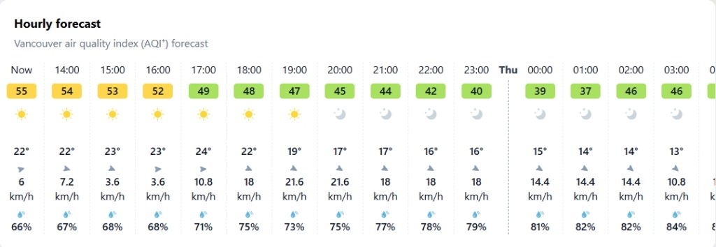 大温地区指出,虽然部分地区的空气质量可能较差,但预计不会发布空气质量预警。截至今天中午 12:30,温哥华在 IQ Air 的空气质量排名中位列主要城市第 44 位,空气质量为中等。主要污染物是 PM2.5,即空气中直径小于 2.5 微米的细颗粒物。