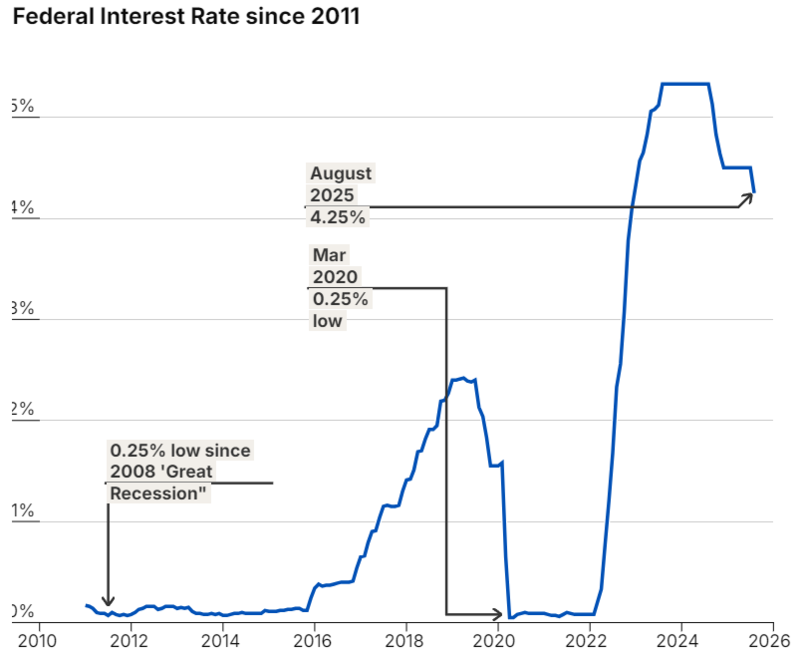 当地时间9月17日,美联储最新的联邦公开市场委员会(FOMC)货币政策会议纪要显示,美联储决定将联邦基金利率目标区间下调25个基点,至4.00%-4.25%之间。这是美联储自2024年12月以来的首次降息。