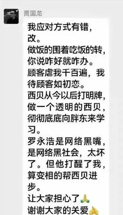 事情是这样的,在罗永浩发文宣布“停战”后,贾国龙也在自己朋友圈写一段话,他的原文是这样写的: