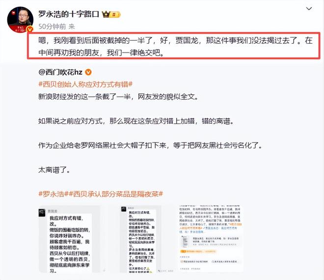 我应对方式有错,改。做饭的围着吃饭的转你说咋好就咋办。顾客虐我千百遍,我待顾客如初恋。西贝从今以后打明牌做一个透明的西贝彻彻底底向胖东来学习。罗永浩是网络黑嘴是网络黑社会,太坏了。但他打醒了我算变相地帮西贝进步。让大家担心了,也谢谢大家的关爱。