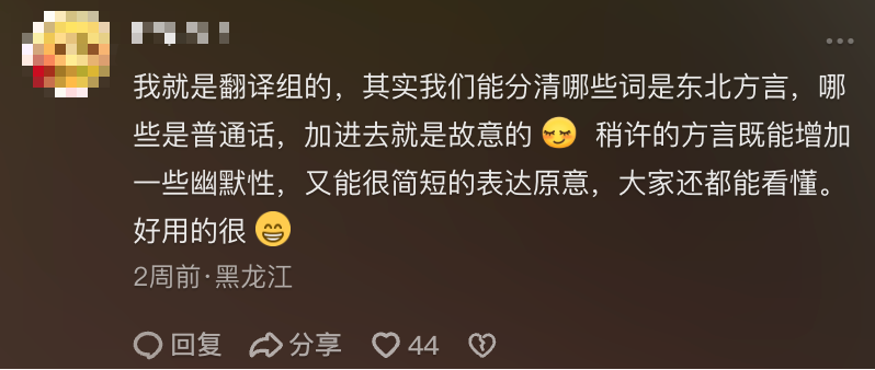 “不光东北,细心的话,能发现很多地方的翻译者都有自己的玩法,基本上是百花齐放。”