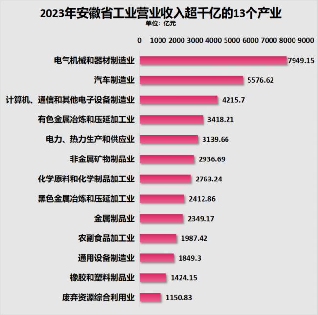 根据安徽省公布的2024年统计年鉴披露,2023年安徽共有13个千亿产业,其中汽车制造业营业收入位居第二,为5576.62亿元。