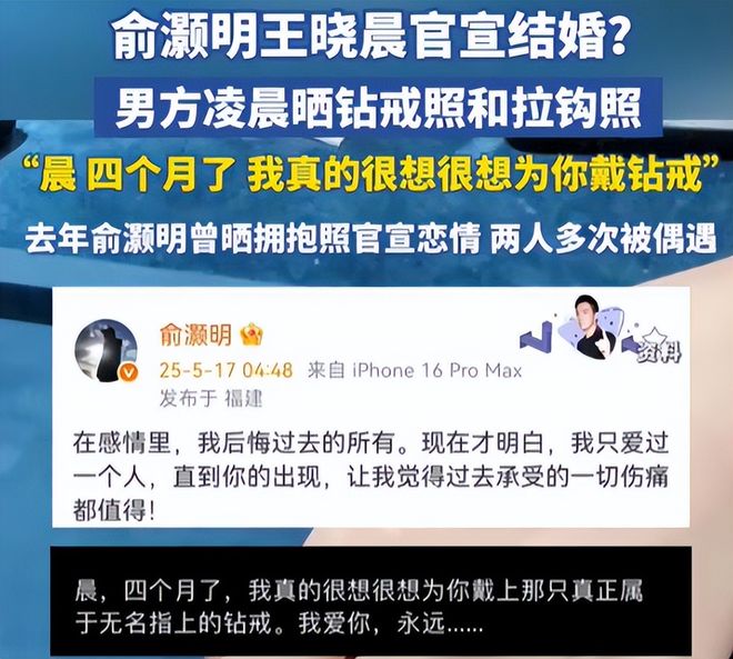 截至 2025 年,俞灏明和王晓晨的暧昧传闻已经持续了 4 年。这一年,俞灏明似乎终于按捺不住,在 5 月中旬的凌晨,突然发文 “表白”。
