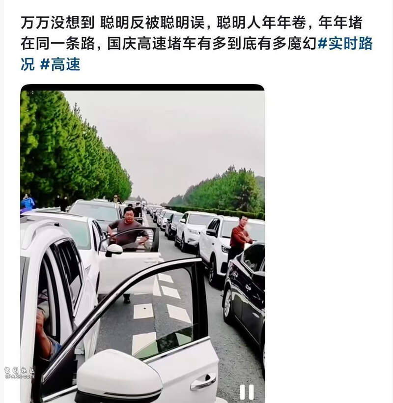 高速公路也堵车了。有网友去年在9月30日深夜出发,没想到路上有不少“大聪明”;今年提前了整整一天,还是遇到了大量“大聪明”。