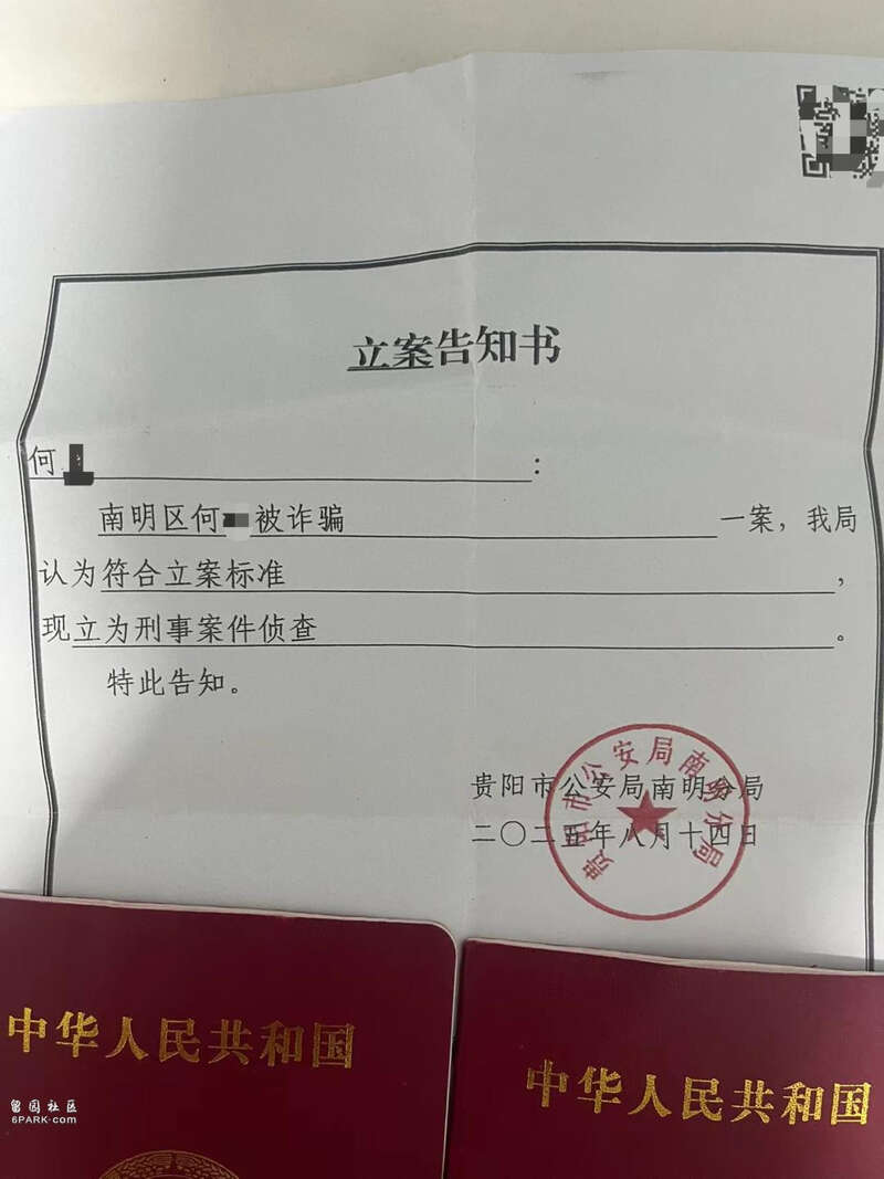 另據何先生提供的立案告知書顯示,何某被詐騙壹案,貴陽市公安局南明分局認為符合立案標准,立為刑事案件偵查,落款日期為8月14日。