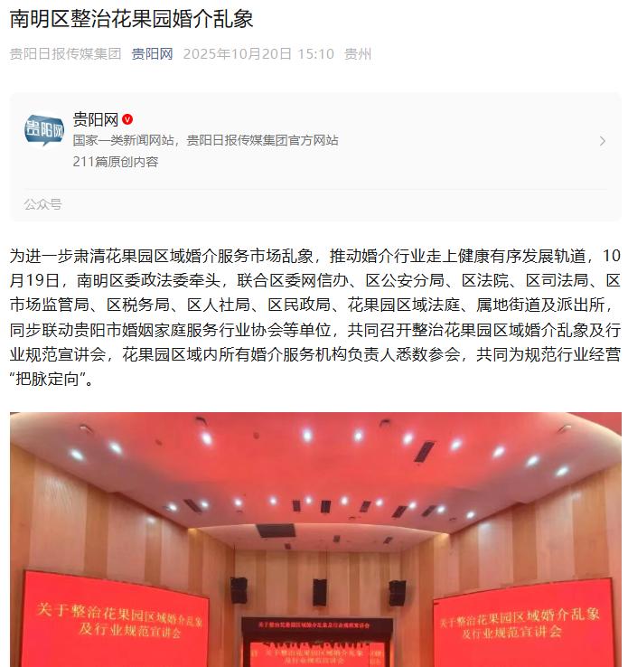 大皖新聞記者注意到,10月20日下午,貴陽日報傳媒集團官方賬號還發布了壹篇名為《南明區整治花果園婚介亂象》的文章。早前,貴陽市公安局南明分局官方賬號也發布了壹篇名為《婚前這叁件事缺壹不可》的文章,文中詳細披露了婚騙常用“套路”,其中便有通過“閃婚+雙騙”套取錢財的行為。
