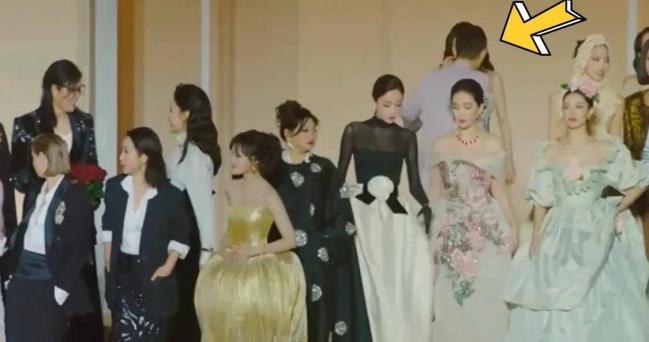 杨幂和刘亦菲中间留了一个小缝,Vogue主编刘冲挤了进来,这个位置站两位大花本来就挺挤的,刘冲站进来的时候就踩到了刘亦菲的裙子,场面更尴尬了。