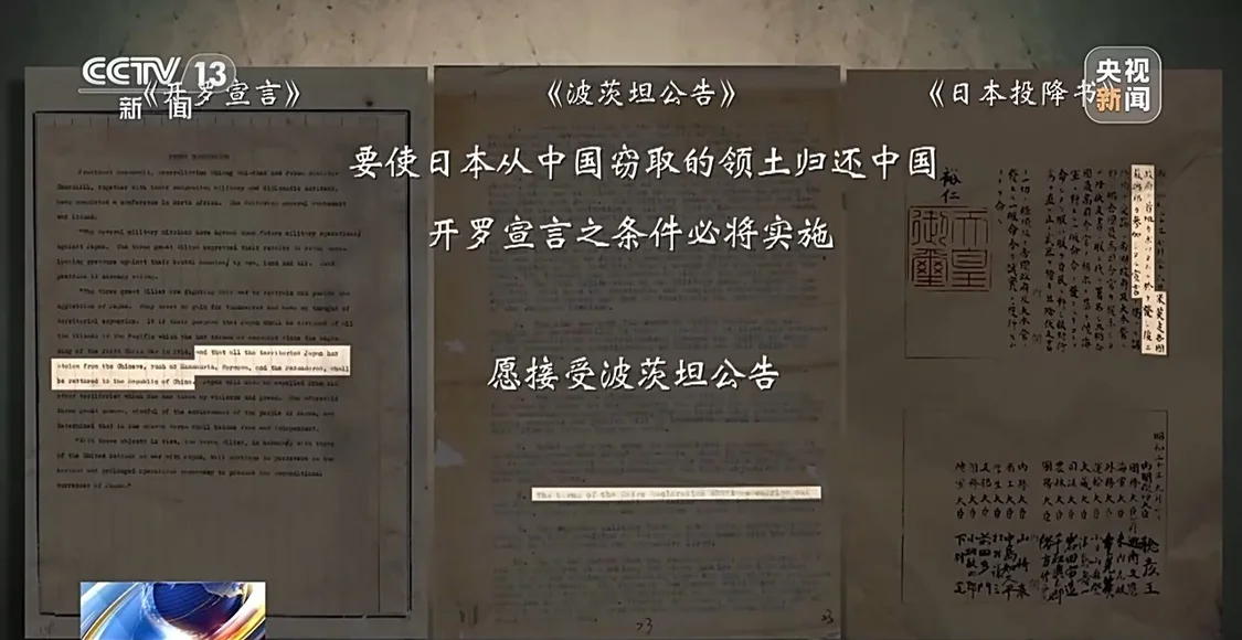 1945年,中美英三国共同签署,后来苏联参加的《波茨坦公告》,重申“开罗宣言之条件,必将实施”。