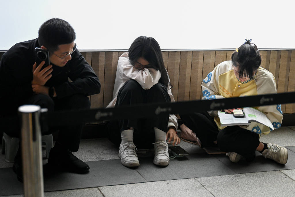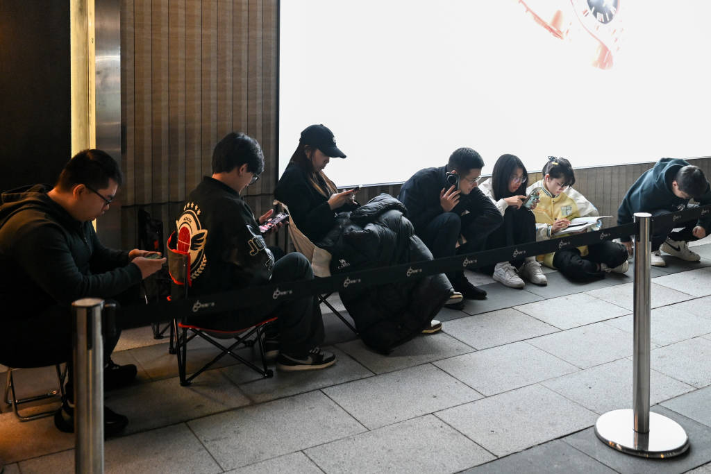 10月24日深夜,上海,排队等候的顾客有的坐在板凳上,有的坐在地上,刷着手机。澎湃新闻记者 朱伟辉 图
