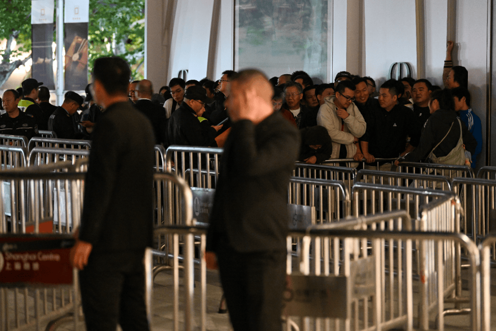 10月24日深夜,上海,顾客在恒隆广场外面排队等候。澎湃新闻记者 朱伟辉 图