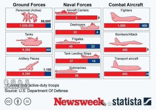 (2020年的兩岸軍事力量對比,近伍年差距進壹步擴大,圖片來源:美國《新聞周刊》)