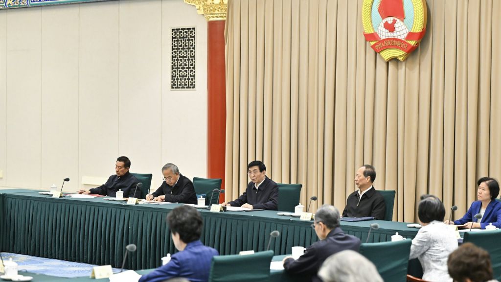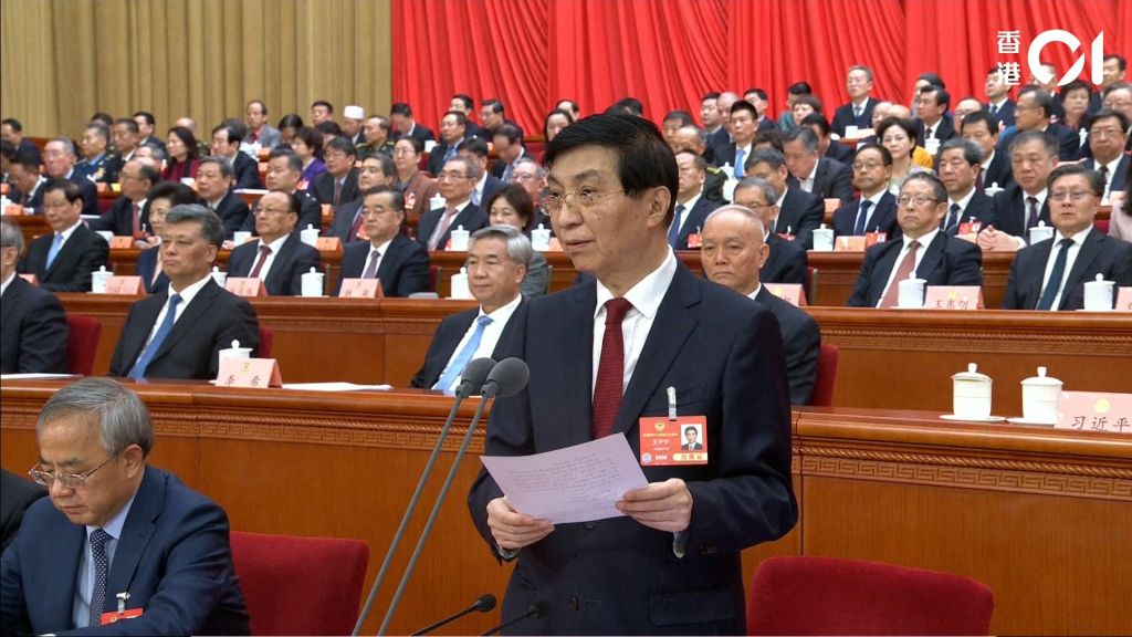 今年3月10日,全国政协十四届三次会议闭幕,全国政协主席王沪宁发表讲话。(香港(专题)01直播截图)