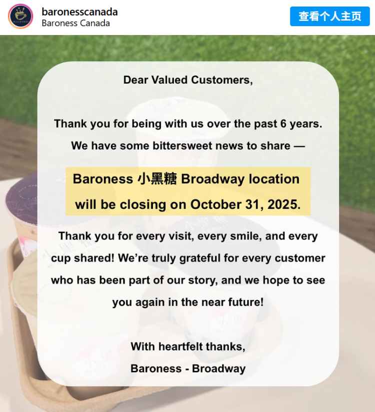 开在Broadway的这家台式黑糖奶茶店,经营了6年。它是该品牌在温哥华开的第一家店,最后营业日是10月31日。等关门之后,加拿大只剩多伦多的两家分店。