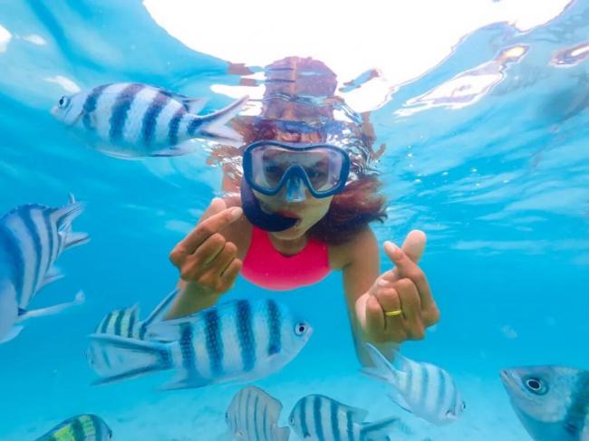 除了在海岸边拍照,越来越多的人开始尝试浮潜拍照。这项宣传"不会游泳也可以"的活动吸引了许多出片客,戴着一根呼吸管就能得到和许多鱼儿共游的照片,确实很令人心动。