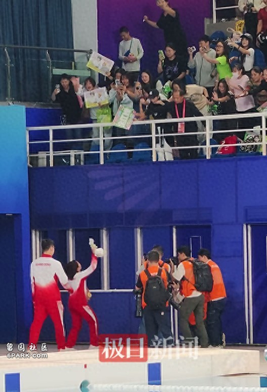 赛后,在颁奖仪式上,全红婵和陈艺文等队友跳着站上领奖台,最后还在场边与看台上为她加油的观众互动,满场跑着接观众丢下来的娃娃。