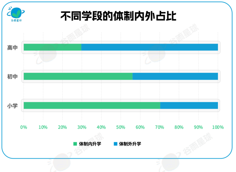 从人口来看,66.1%的家庭是独生子女,31.4%有二宝在接受教育,也有9个家庭有三宝在受教育,占了1.8%。从孩子就读学校类型来看:体制内中高考路线占了47.2%,体制外超过一半,还有海外学校。随着孩子的长大,体制外的比例越来越多,几乎呈等差数列,这也跟国际教育里小初高就读人数也呈现倒金字塔型结构一样:幼小最少,高中最多,小升初和中考后转轨的孩子越来越多。