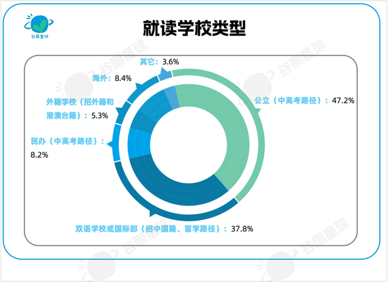 而在国际教育路线里,双语学校人数37.8%,外籍学校5.3%,还有10.8%就读于海外学校,其中欧洲和新加坡大幅上升。