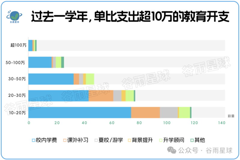 随着单笔开支的增加,升学顾问的重要性越来越大:在30~50万和50~100万的区间里,其占比最多,赶超补习班等其他开支。