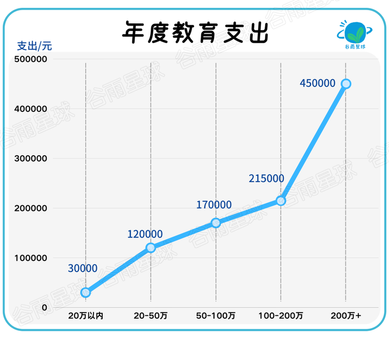 去年,收入100~200万的家长会明显增加教育开支,高达36万,而今年这个数字变成了21.5万;年入200万以上的家庭,开支48万,也比去年的60万有所降低。