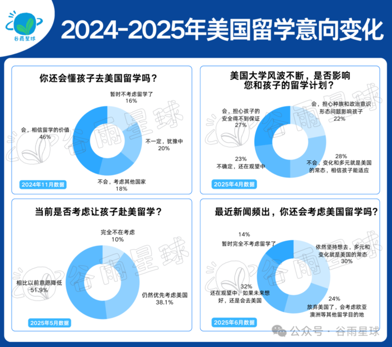 早在去年11月时,老特还没上台,我们就做了一次问卷调查,超过2000多名读者填写了互动问题“你未来还会打算去美国留学吗?”心态仍然很乐观:超过46%的家庭选择“是”,一共有1161票,仍然相信美国留学的价值。3月底,我们做了一次小调查:49%的人选择美国大学风波会影响自己的留学计划;28%的人仍然很坚定,23%的人选择观望。5月初,新的问卷调查继续印证我们的体感:仅有38.1%的人仍然优先考虑美国,相比以前意愿降低的人共有51.9%,完全不再考虑的家长有10%。进入6月后,2017份投票中,30.29%坚定美国,24%转投其他国家,31.73%的摇摆派,观望情况中,而有14%的人放弃了留学计划。