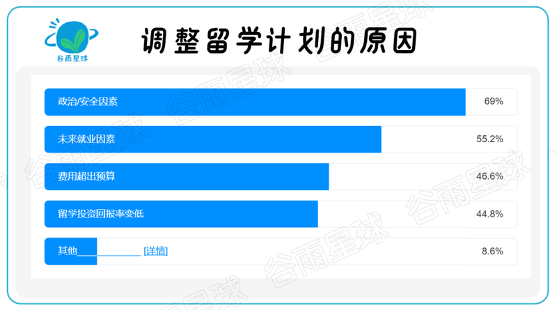 调整原因最多的是政治和安全因素,其次是就业,也有46.6%的家庭选择了费用超出预算,44.8%的家庭选择了投资回报率在变低。