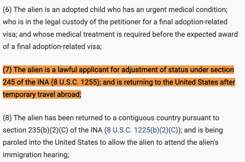 7?? 綠卡申請人回美:已遞交 I-485 (身份調整 AOS)申請者,在等待綠卡期間持 Advance Parole 短期出境再回美者。