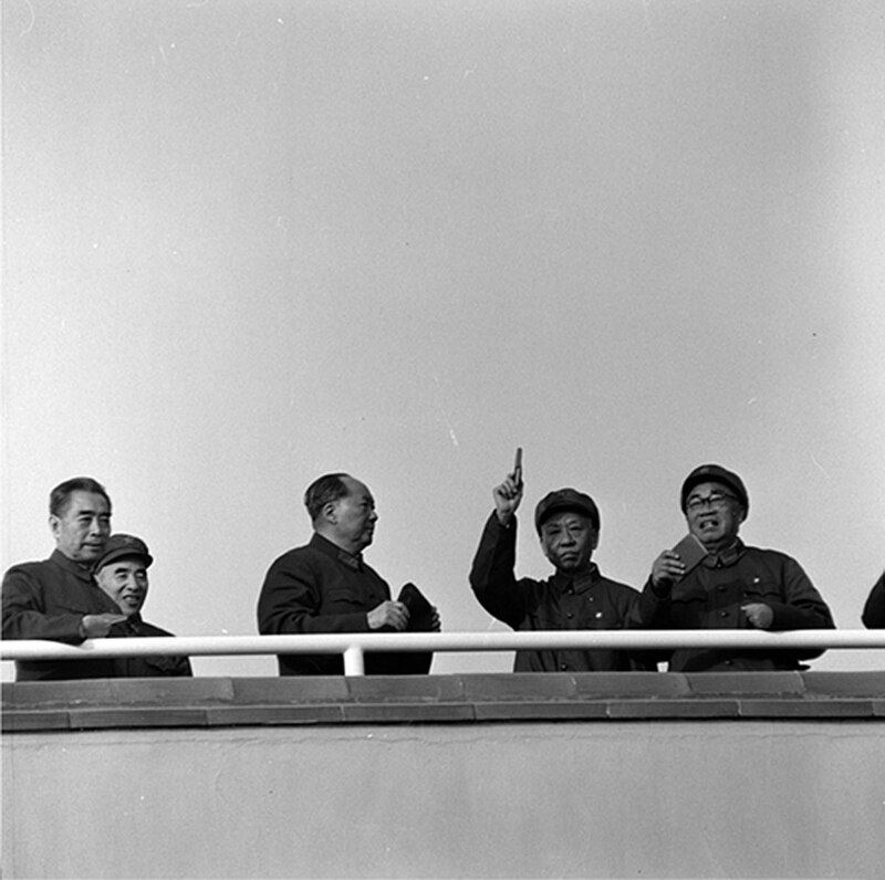 1966年9月15日,周恩来、林彪、毛泽东、刘少奇、朱德在天安门城楼上接见红卫兵。(图/翻摄维基百科)