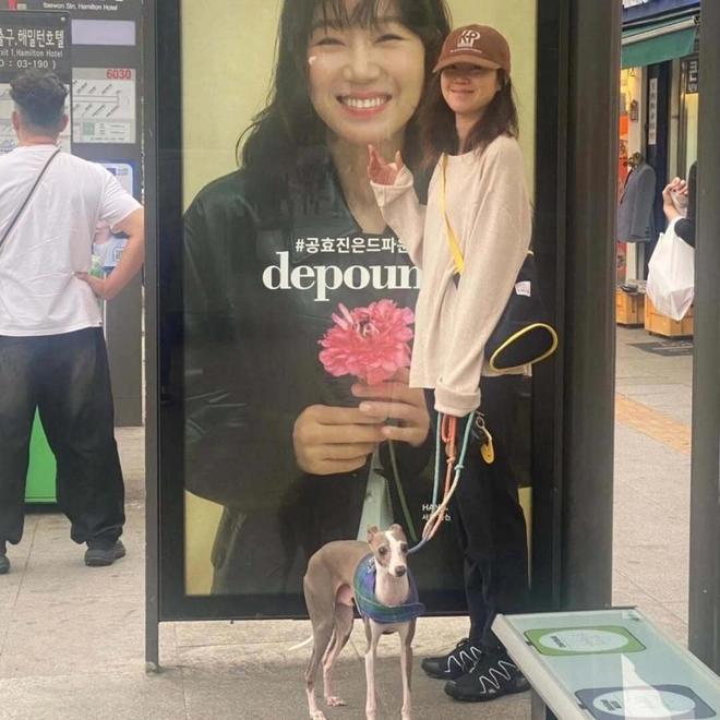 可愛歐尼每次見到自己廣告牌都會忍不住打卡,和廣告牌中自己形象不同的是,現實生活中的她戴著鴨舌帽素顏入鏡,穿搭以精致休閒為主,樸素的讓人不敢認。