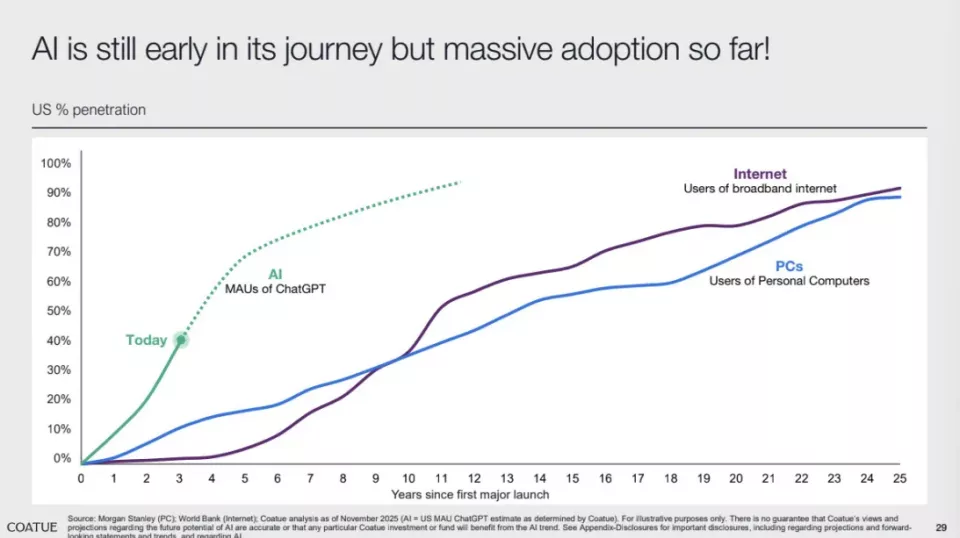 历史上,许多被认为是“泡沫”的现象——如互联网、电力、云计算——最终都演变成了长期存在的基础设施。Coatue认为,AI 正在沿着同样的路径发展:从短期的投机热潮,迈向长期的生产力革命。