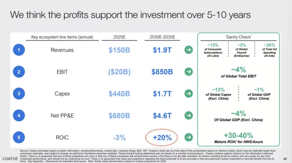 到2035年,AI驱动产业每年有望创造1.9万亿美元的收入,并实现20%的投资资本回报率(ROIC)。Coatue预计,随着AI技术渗透到更多领域,利润率还将持续提升,推动产业进入新的增长周期。