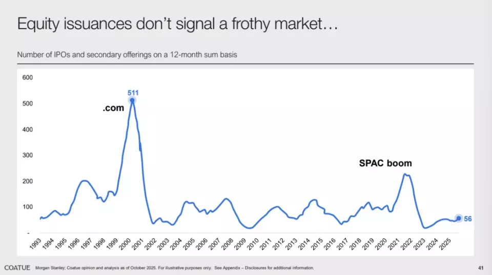 2025年的股票发行总数(包括 IPO 和二次发行)仅为56起,远低于2000年泡沫高峰时期的511起。这表明企业并未盲目追逐资本市场的热度,市场情绪更为理性、资金流动更健康。
