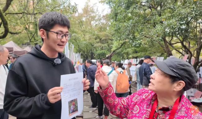 潘天鸿拿著一张附有照片和简介的A4纸在站在相亲角,内容写道“国内学历:初中”、“婚姻状况:离异单身”,并表示自己是独生子,父亲从事快递相关工作,母亲则负责照顾家庭。结果被在现场帮女儿物色对象的大妈们吐槽,认为他学历太低,年级轻轻就离过婚太可怜了,而家庭背景也不怎么样。