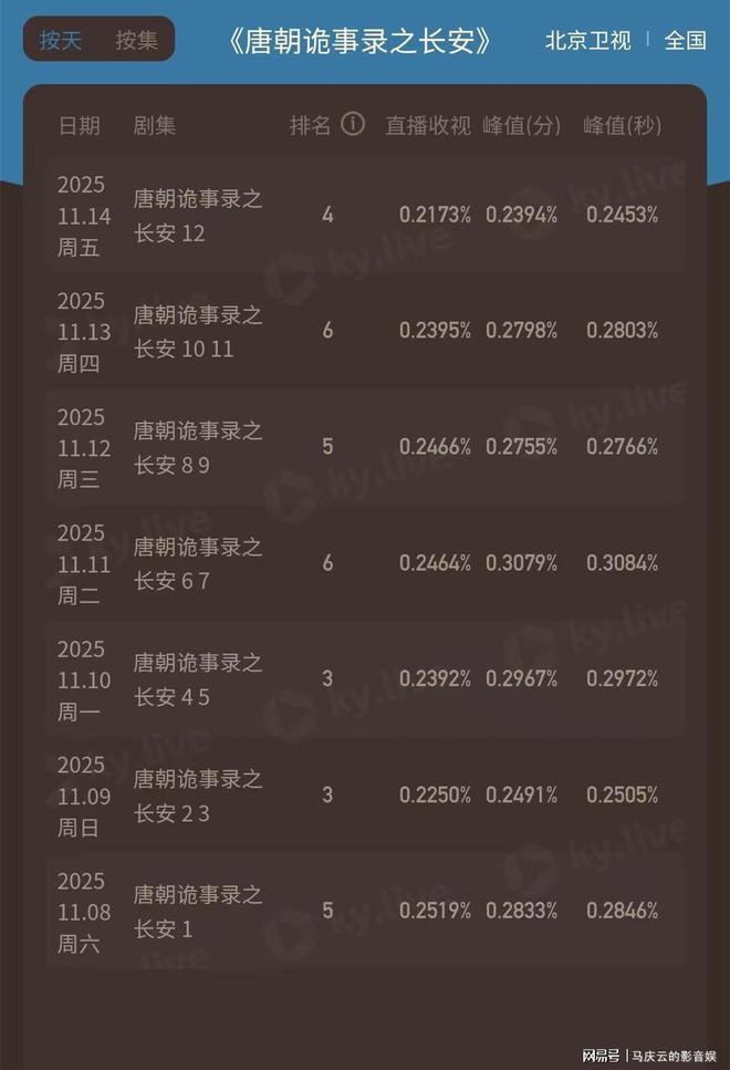 在酷雲上,《唐朝詭事錄之長安》的收視率,出現了非常明顯的下滑態勢。這部電視劇開播首日的收視率是0.2519%,到了11月14日晚間,收視率只剩下0.2173%了。而且,更為掣肘的則是,這部電視劇雖然在壹線大台首播,但收視率還不如壹些重播的電視劇,比較尷尬的事情則是,11月11日當晚,各家衛視播出電視劇,它只在同時段的衛視劇當中收視率排名第6了。這意味著,前邊有5部電視劇,都播出的收視率比它好。