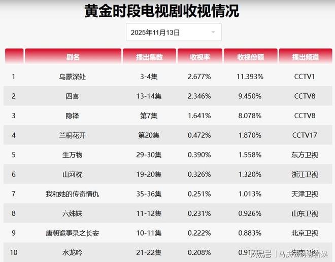 在總局的中國視聽大數據上,也可以管中窺豹了。目前,中國視聽大數據上開出的離我們最近的壹天的收視率,是11月13日的。《肆喜》高達2.346%,而北京衛視的《唐朝詭事錄之長安》則只有0.222%,排名第九。