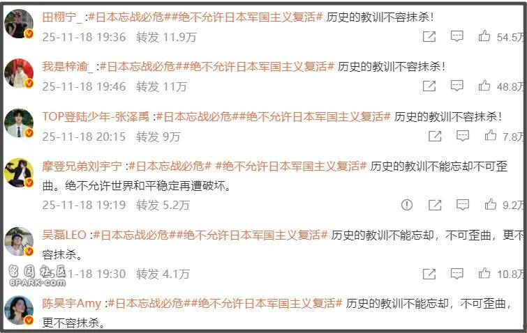 瀏覽轉發區,大約有近兩百位藝人參與轉發,都表示歷史的教訓不容抹殺,督促日本忘戰必危。轉發量較大有肖戰、吳磊、田栩寧等新生代,像陳昊宇、劉宇寧等等也都在熱門轉發區,而如黃曉明、杜江等藝人的轉發就靠後。總的來說除了壹線藝人轉發外,贰叁線及短劇的演員也加入其中,可以看出此次形勢非常關鍵。