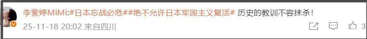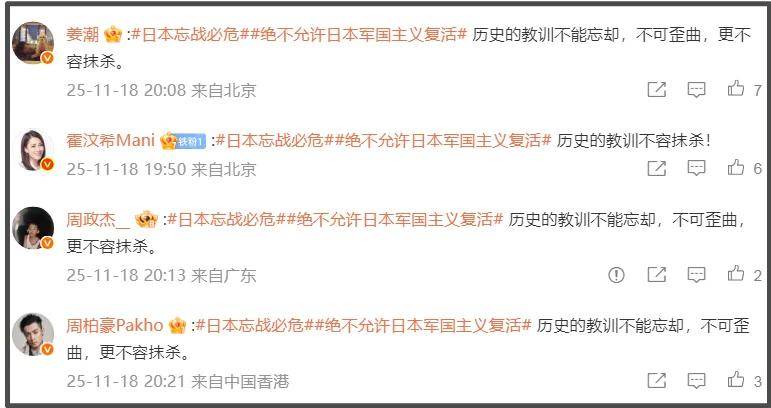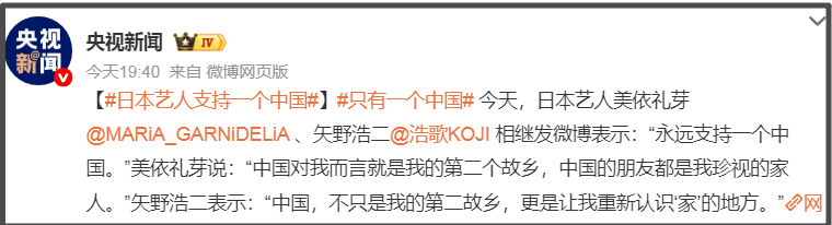 而泰籍華裔(专题)李紫婷也堅決表示不允許日本軍國主義復活,歷史的教訓不容抹殺。此外,美依禮芽、矢野浩贰表態堅持壹個中國原則也得到央視新聞的點贊,可見中國對立場正確的日本藝人持歡迎態度。