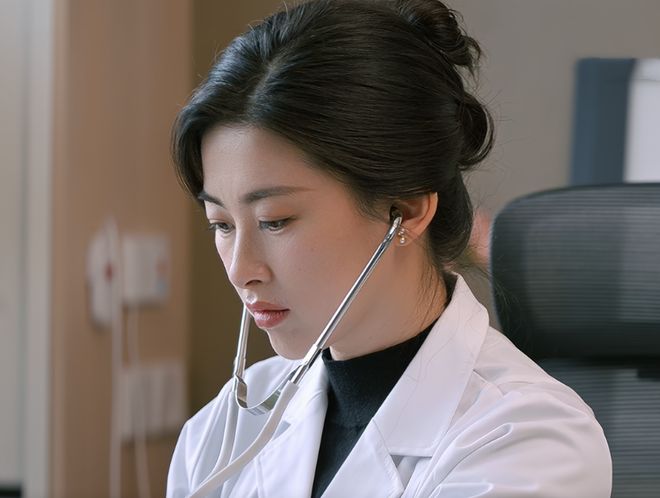 工作時間穿著白大褂,戴著聽診器專注的盯著血壓計,伍官精致,迎著陽光的側臉輪廓被打上壹層柔光,皮膚白皙,清冷感拉滿。