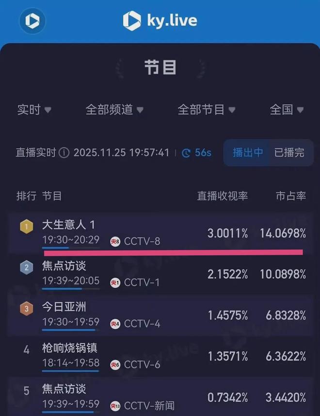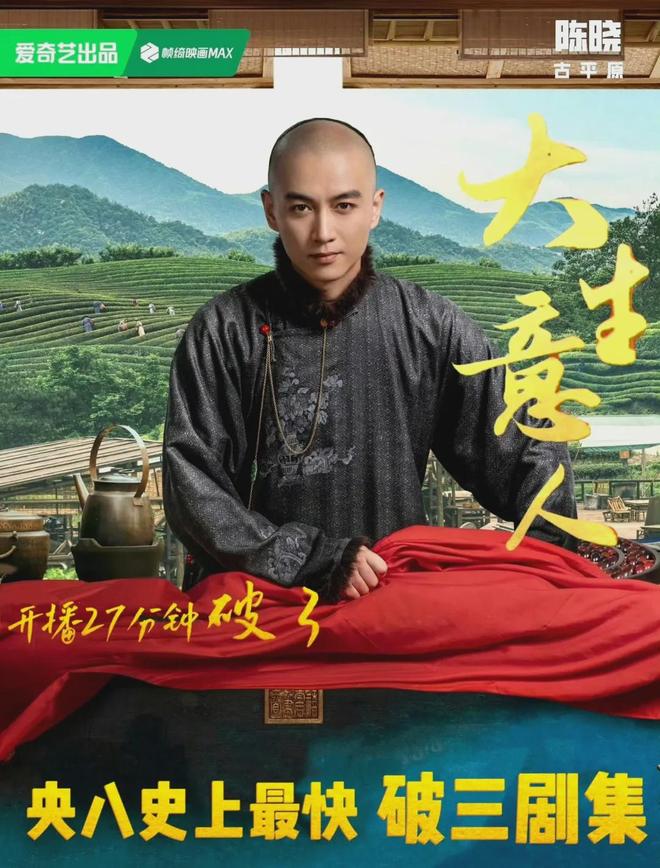 由陈晓领衔主演的晚清商战剧《大生意人》,开播仅15分钟猫眼关注度达3.29%,27分钟酷云实时收视率突破3%,峰值冲至3.2%,打破央八过往所有剧集的破3速度纪录。