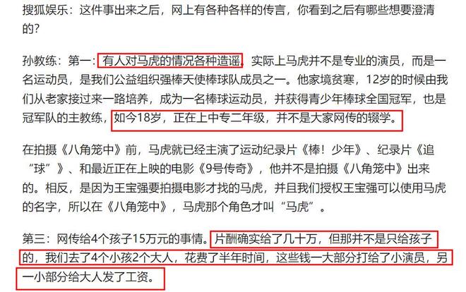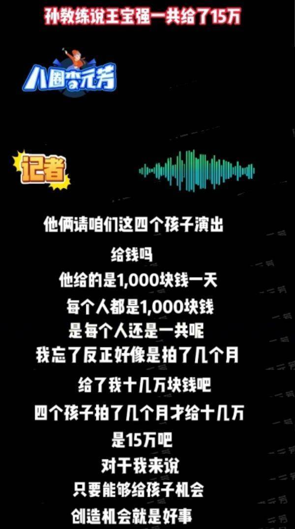 从狗仔放出的与几位小演员的教练孙教练的聊天录音中可知,孙教练说王宝强对外宣称资助小演员是吹牛。而且该录音中还提到,4位小演员拍戏3个月,王宝强给了他们15万。
