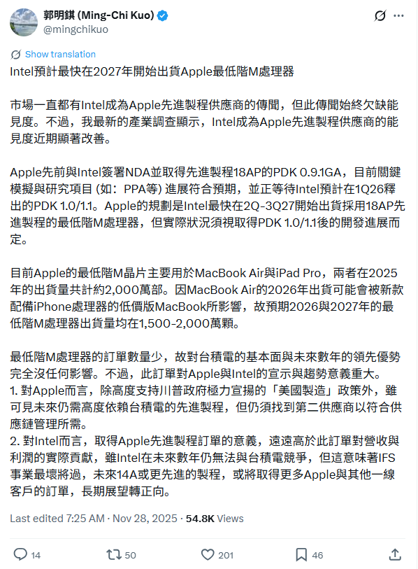 然而,需要强调的是,这项合作目前仍未获得苹果或英特尔的正式确认。尽管郭明錤过去的供应链预测准确度极高,这一潜在合作仍需跨越数项关键门槛。例如,英特尔必须证明其 18A-P 制程的稳定性、良率与能效表现能够满足苹果极高的验证标准。此外,双方也必须完成商业条款、产能布局、成本结构等多项谈判。若美国政府进一步强化推进本土生产的政策,合作时间表甚至可能被提前。