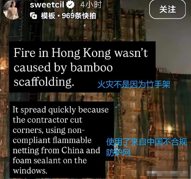 她急於替建築中的“竹子”開脫,聲稱竹子不是易燃物,不應該被指責,緊接著她把矛頭直接指向建材來源,寫著“這些問題是因為使用了來自中國的不符合標准的易燃網和泡沫密封劑”。