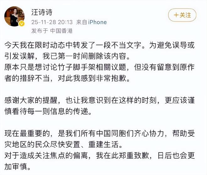 當海外平台的質疑聲傳回國內,汪詩詩意識到事態嚴重,刪除了那條Instagram動態,並在微博上發聲道歉,她表示轉發時沒有仔細甄別內容,對造成的困擾道歉,態度看上去誠懇,反應也迅速。