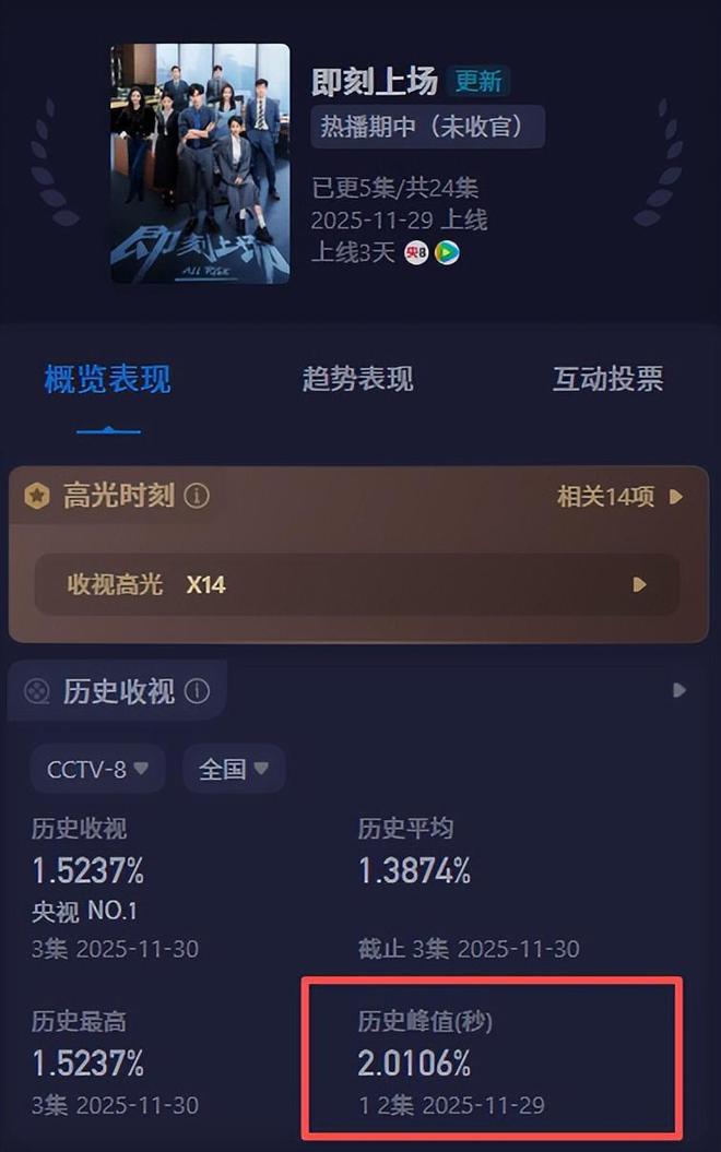 不过,上述两部剧还暂时没有好消息传来,反倒是央视率先抬上来一部新剧《即刻上场》,开播后收视率火速破2,看来都市职场剧迎来了新的天花板。