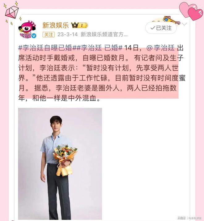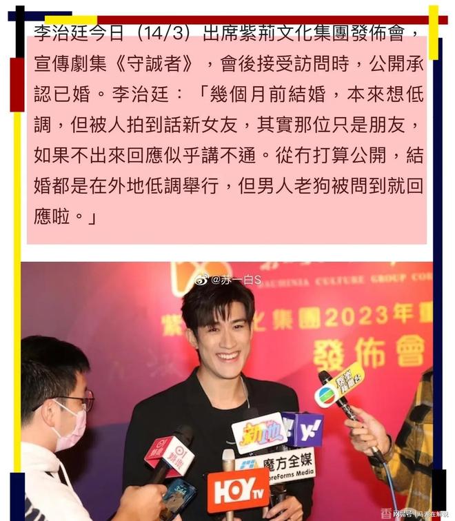 38歲李治廷2023年3月份出席活動主動曝自己結婚了,老婆不是娛樂圈的,是中外混血,兩個人已經低調戀愛好多年了,感情甜蜜,李治廷滿臉笑容,幸福滿滿!狗仔曾拍到李治廷帶女友見媽媽,兩個人很甜蜜,女方顏值挺高!