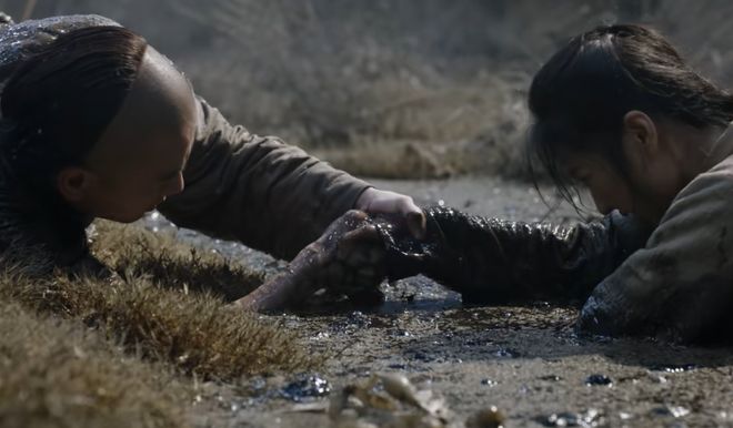 比如沼泽地那场戏,女主只剩下一个脑袋露在外面,命都要没了,脸上也不见多么惊慌。