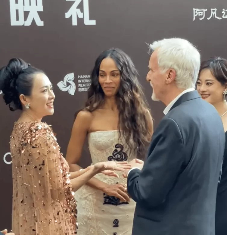 現場要拍攝紅毯大合照,卡梅隆和《阿凡達》女主佐伊站中間,章子怡、黃軒、鄧超、孫儷兩兩分組,各自站到兩邊,章子怡和卡梅隆很快熱聊了起來,佐伊站在贰人身邊,時不時和卡梅隆說上兩句,叁個人氣氛很是和諧。