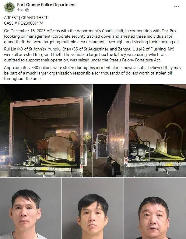 事实上,这并非首次有华人偷“地沟油”被抓,2023年12月,佛罗里达警方逮捕三名涉嫌盗窃餐馆废弃食用油的华人男子,其中一人此前曾因同类犯罪被捕,被认为与一个有组织的地沟油盗窃团伙有关(详情点击:)。