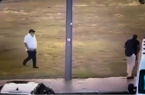 监控画面显示:一名男子手拿砖块走向持枪凶手。图源:澳媒